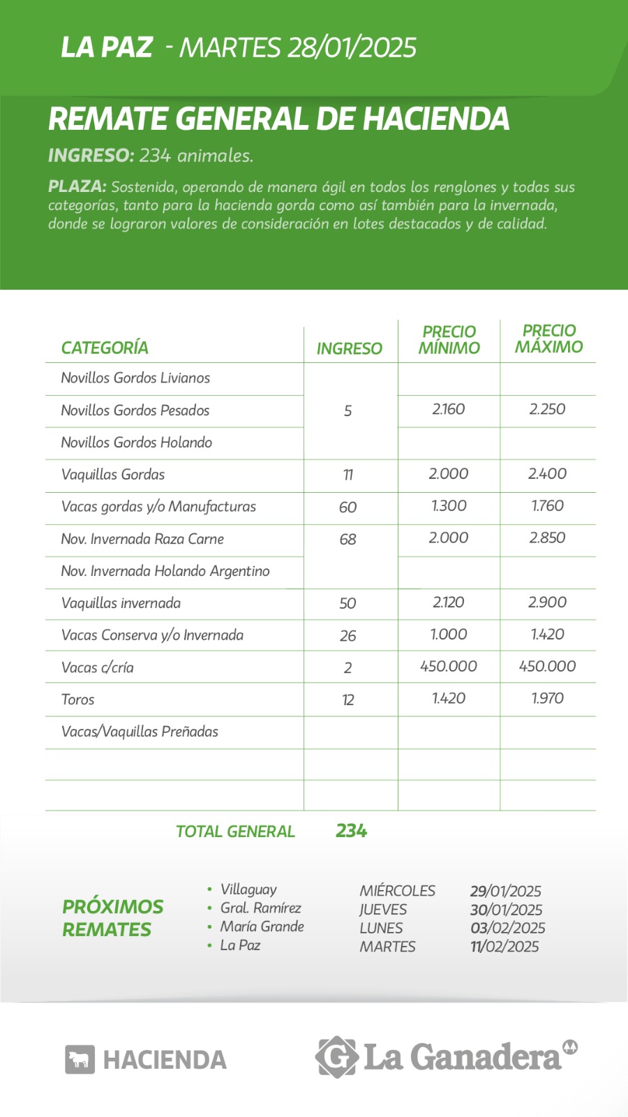 Desde Cooperativa La Ganadera de General Ramírez dieron a conocer los valores mínimos y máximos que se obtuvieron en el remate general de hacienda del martes 28 de enero en el predio ferial de La Paz. En total ingresaron 234 animales.