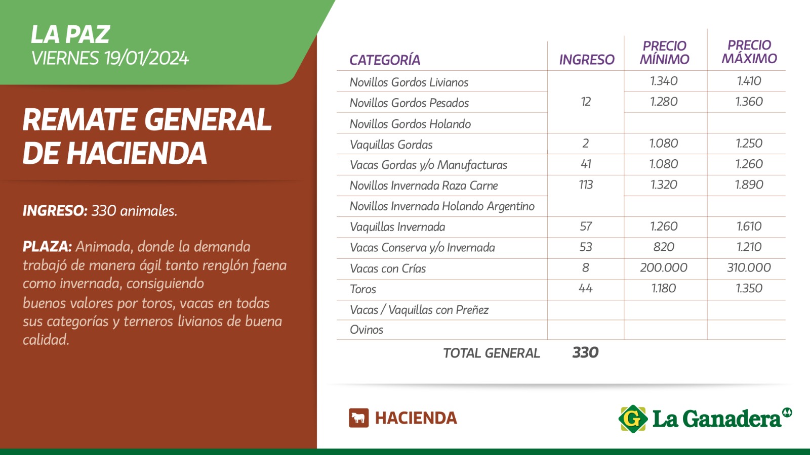 Desde Cooperativa La Ganadera de General Ramírez dieron a conocer los valores mínimos y máximos que se obtuvieron en el remate general de hacienda del viernes 19 de enero en el predio ferial de La Paz. En total ingresaron 330 animales.