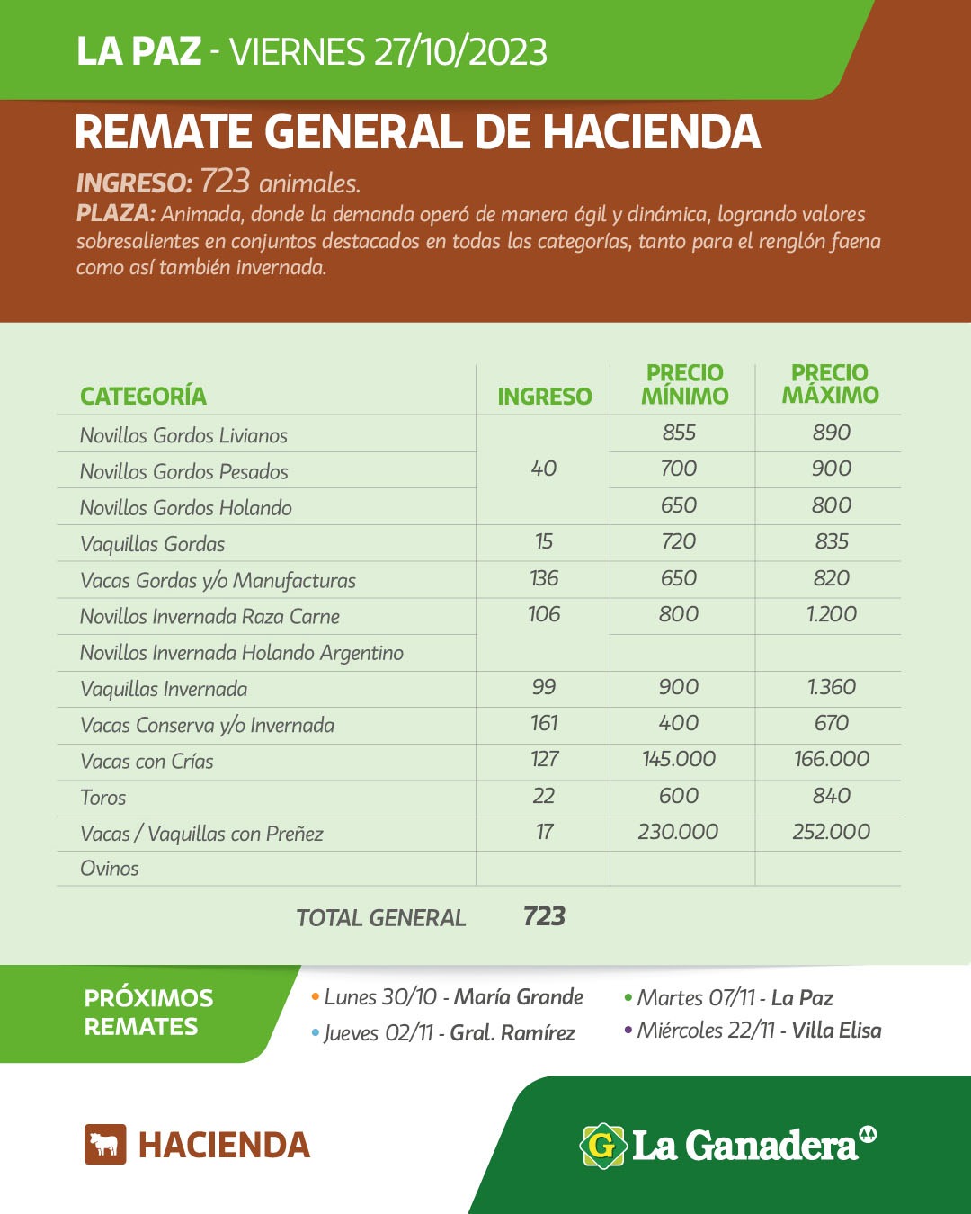 Desde Cooperativa La Ganadera de General Ramírez dieron a conocer los valores mínimos y máximos que se obtuvieron en el remate general de hacienda del viernes 27 de octubre en el predio ferial de La Paz. En total ingresaron 723 animales.