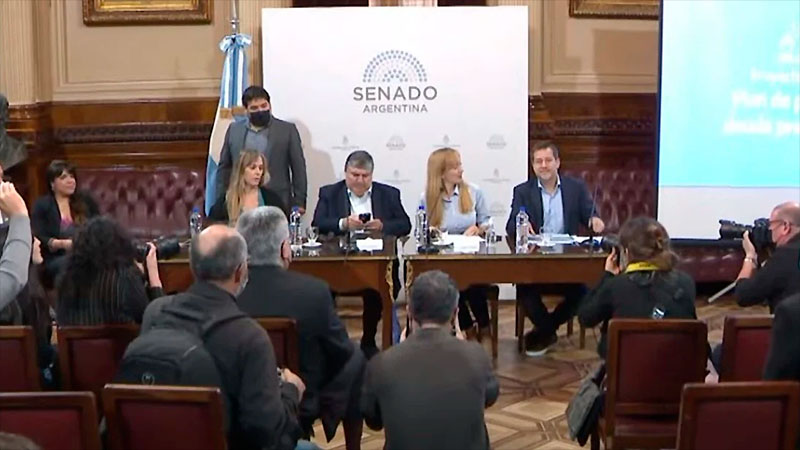 En una conferencia de prensa en el Senado, la conducción del interbloque del FdT, José Mayans, Anabel Fernández Sagasti, y Juliana Di Tullio junto al senador Mariano Recalde anunciaron la presentación de un plan de pagos que comenzará a debatir la Comisión de Trabajo y Previsión del Senado.