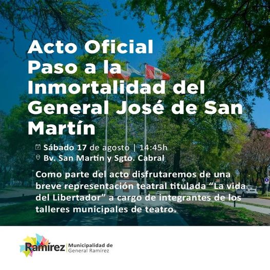 Este sábado 17 de agosto, en General Ramírez, se realizará el acto oficial conmemorando el 174º aniversario del paso a la Inmortalidad del General San Martín.