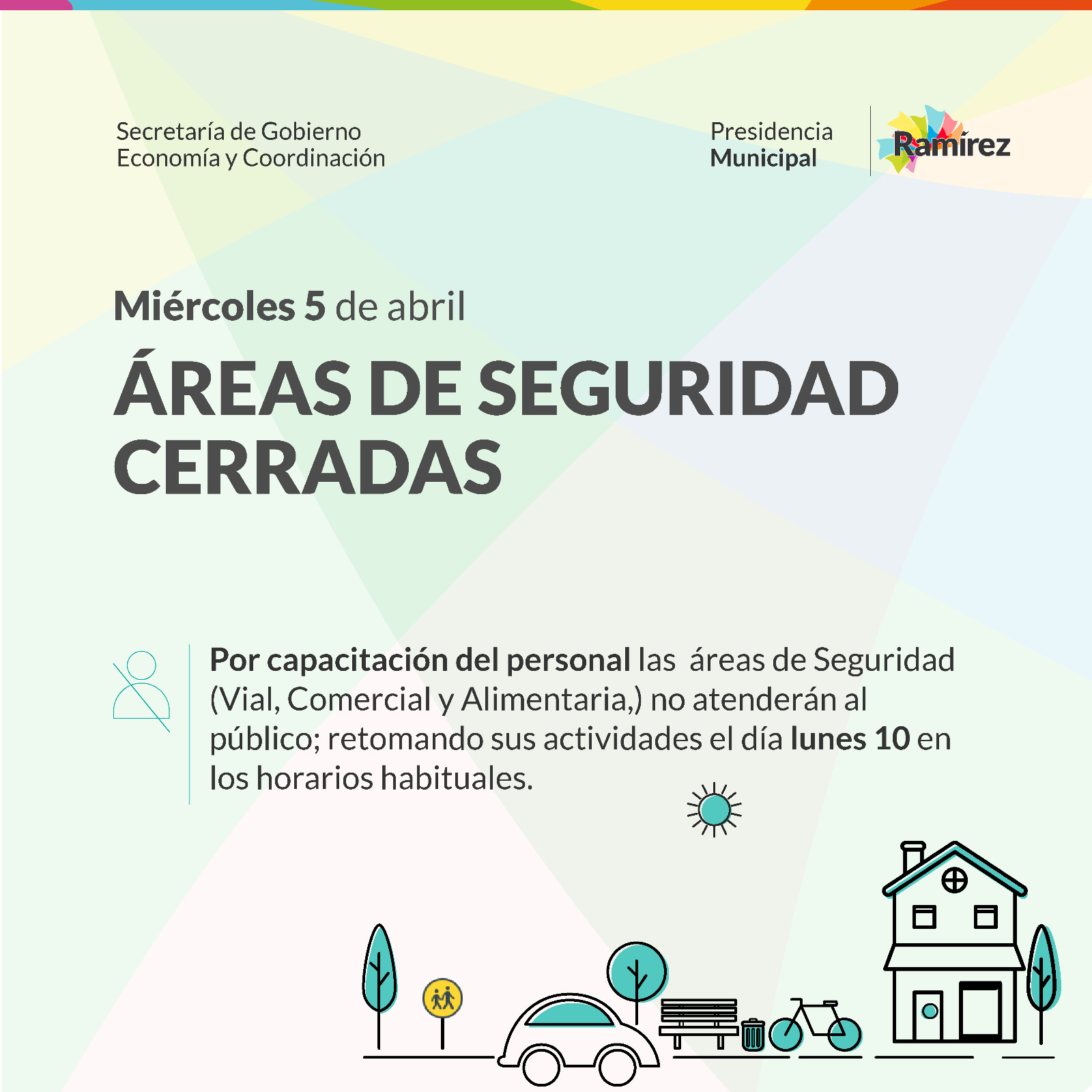 Este miércoles 5 de abril, las Áreas de Seguridad Vial, Comercial y Alimentaria de la Municipalidad de General Ramírez permanecerán cerradas por capacitación del personal.