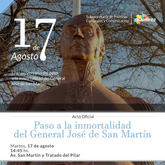 Este martes 17 de agosto se realizará el acto por el 171° aniversario del fallecimiento del General San Martín en Ramírez.