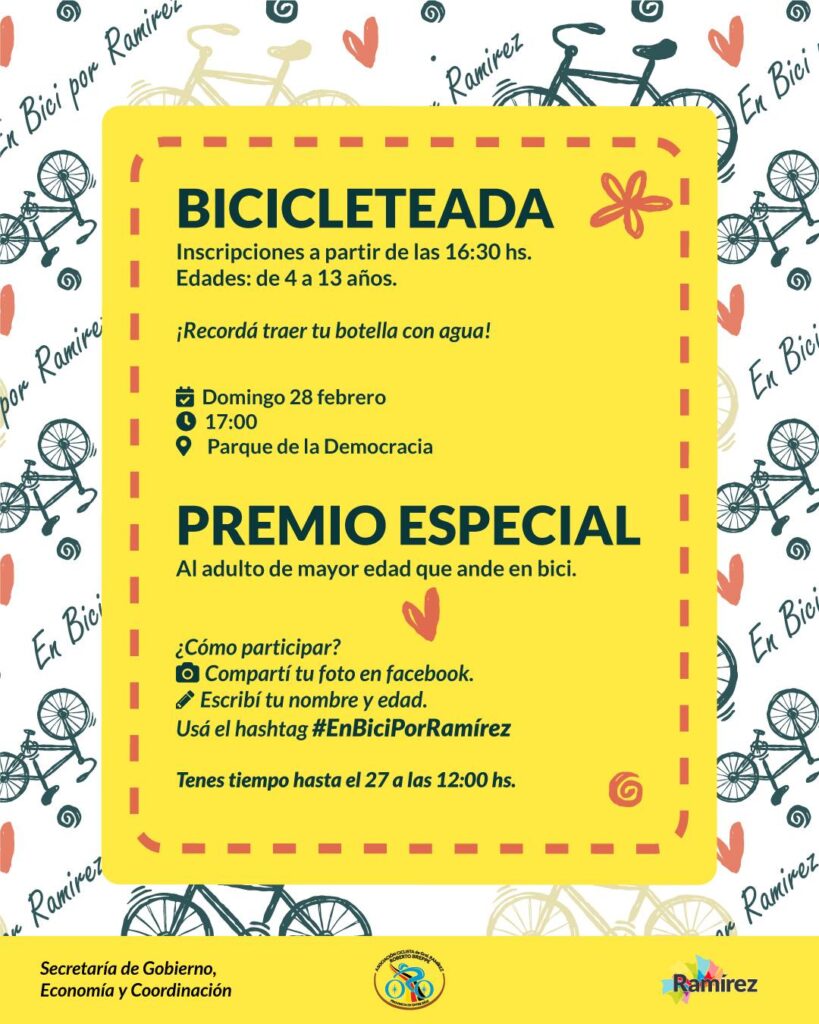 Además, en la oportunidad se premiará al adulto de mayor edad que ande en bici. Para participar del concurso deben compartir una foto el nombre, edad y el hashtag #EnBiciPorRamírez.