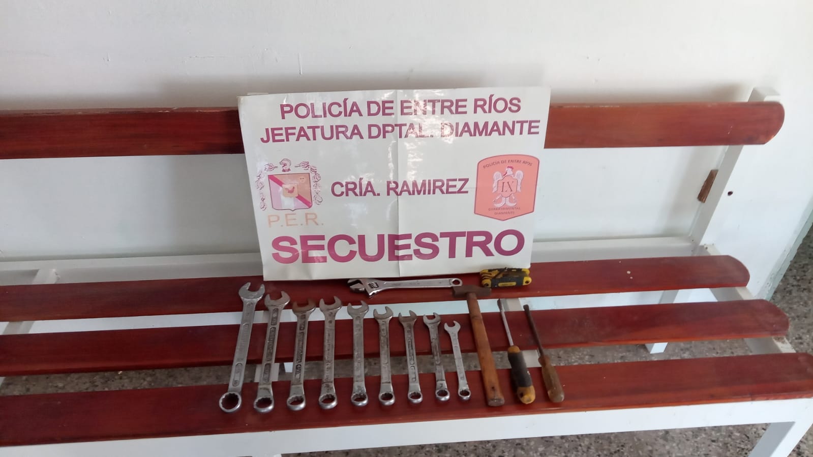 Un vecino de General Ramírez fue víctima de la sustracción de un buen número de herramientas, que se encontraban en su vehículo particular. Acerca del esclarecimiento arribado este jueves, el segundo jefe de la dependencia, Martín Figueroa, expresó: «Se realizaron diversas averiguaciones y tareas investigativas, logrando establecer sospechas que se plasmaron en un informe elevado a la Unidad Fiscal de Diamante, que obtuvo la anuencia para llevar adelante allanamientos simultáneos en dos viviendas de esta ciudad, ubicadas en Barrio Tanque».