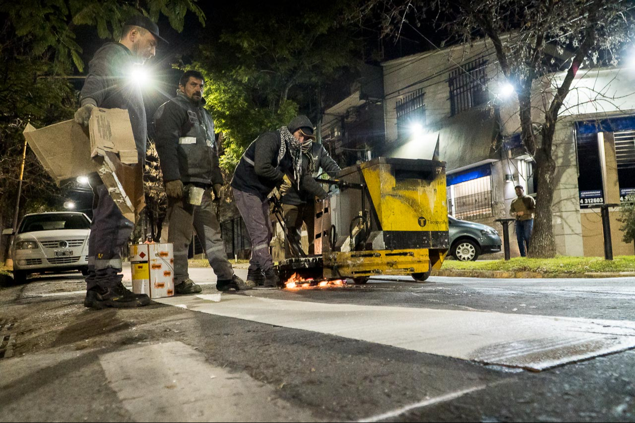 Las labores incluyen la demarcación horizontal de sendas peatonales, así como la aplicación de líneas de contención en material termoplástico, de ochavas en color amarillo y líneas que delimitan las áreas de estacionamiento. Complementariamente, se está renovando la señalización vertical con el reemplazo de cartelería obsoleta y la colocación de nuevos nomencladores, lo que facilita la orientación y el respeto de las normas de tránsito.