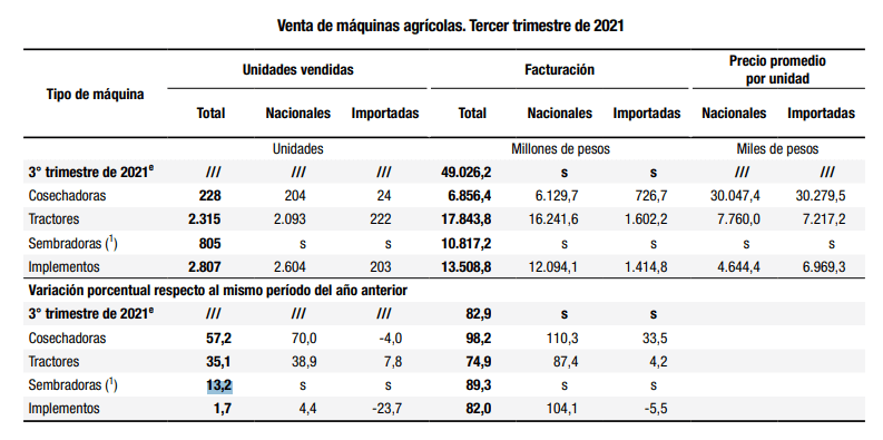 “Las ventas en unidades de producción nacional de todos los segmentos de maquinaria registran aumentos en el tercer trimestre de 2021 respecto a igual trimestre del año anterior”, señaló el Instituto.