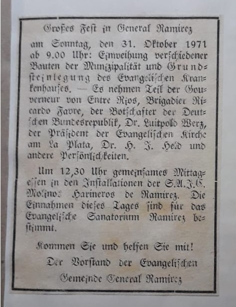 Este domingo 31 de octubre se cumplieron 50 años de la colocación de la piedra fundamental del Sanatorio Evangélico, de la Congregación Evangélica Alemana de General Ramírez, de la Iglesia Evangélica del Río de la Plata.