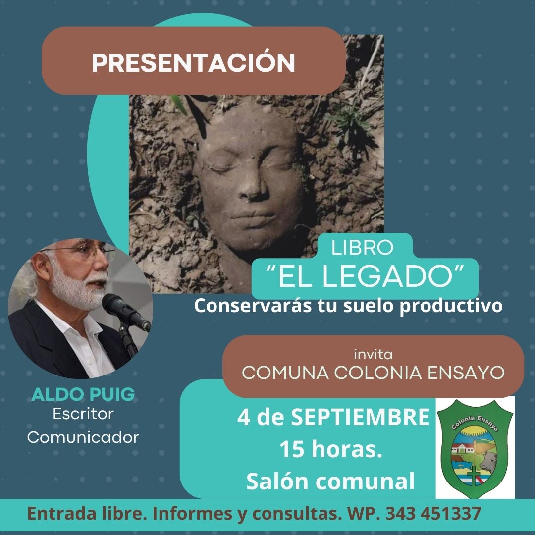 Este miércoles 4 de septiembre, a partir de las 15, en la Sede Comunal de Colonia Ensayo, se presentará el libro El Legado. Conservarás tu suelo productivo del comunicador y escritor, Aldo Puig. La entrada es libre y gratuita.