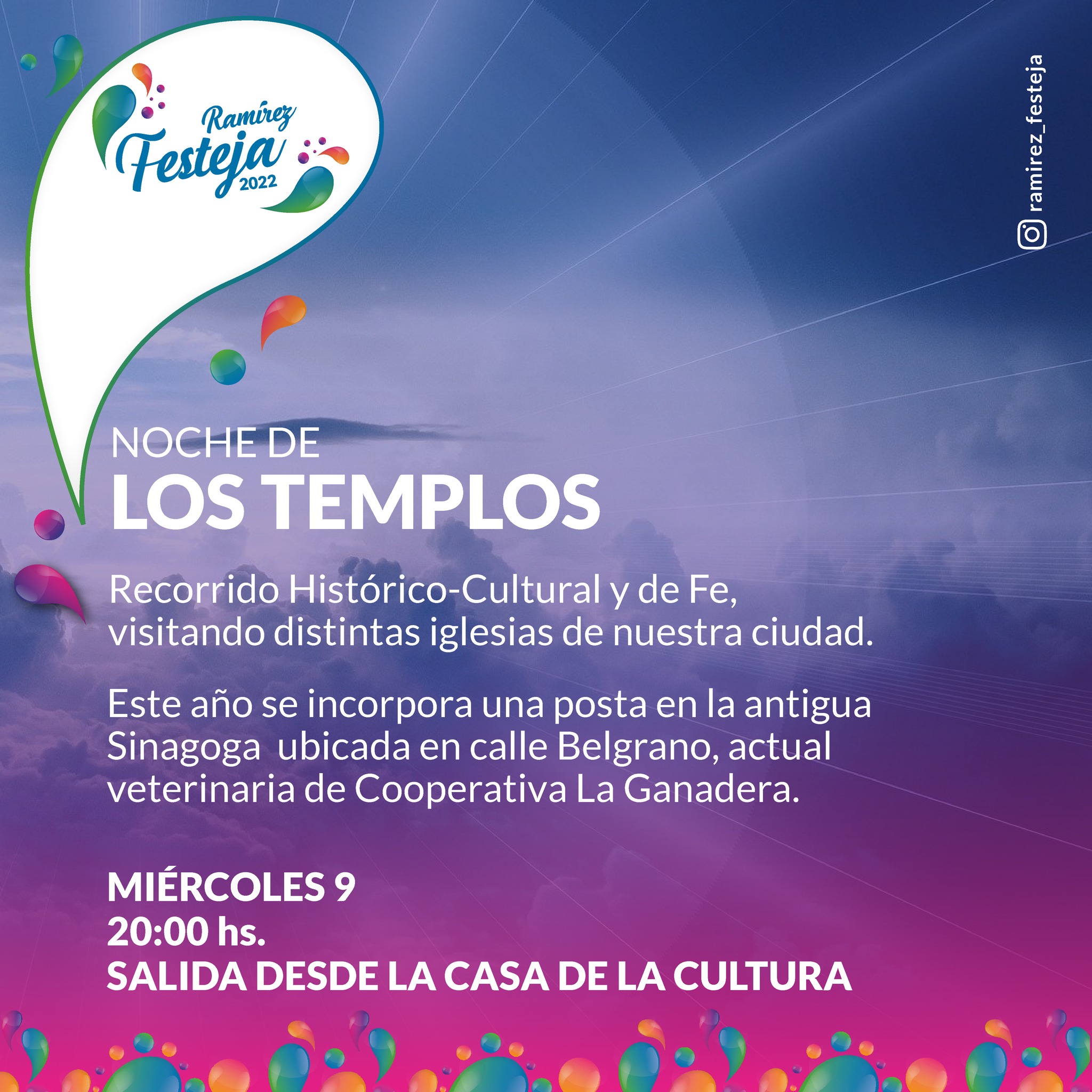 Se suspendió la Noche de los Templos, una tradicional actividad en el marco del Ramírez Festeja. La decisión se tomó debido a las lluvias que afectan la región.