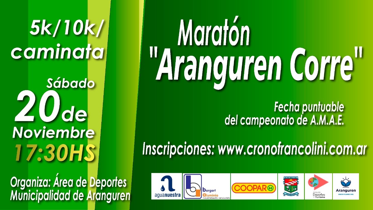 El sábado 20 de noviembre se realizará la maratón «Aranguren Corre». La competencia está prevista para las 17.30 y las distancias serán caminata participativa, 5K o 10k competitivo.