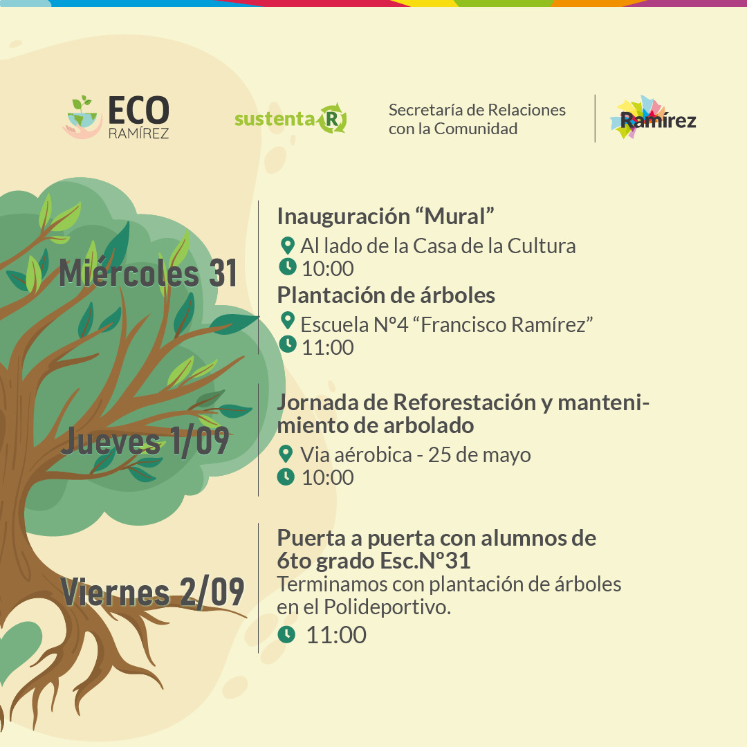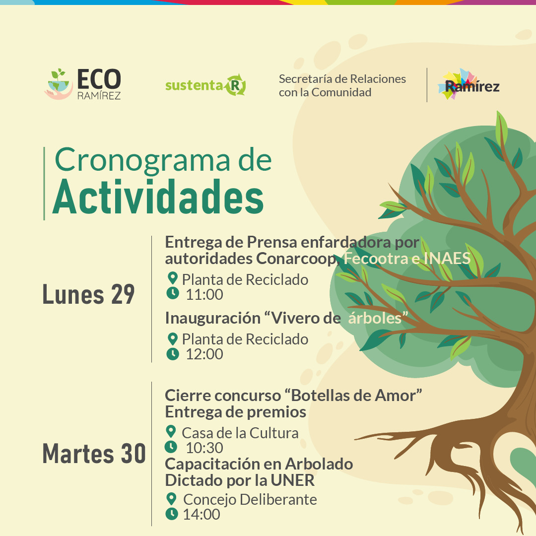 Desde la Secretaría de Relaciones con la Comunidad, en conjunto con el grupo EcoRamírez, invitan a la comunidad a sumarse a las propuestas que incluyen la entrega de prensa enfardadora, inauguración del vivero de árboles, cierre del concurso Botellas de amor, capacitación en arbolado, inauguración de un mural, plantación de árboles, jornada de reforestación y mantenimiento de arbolado.