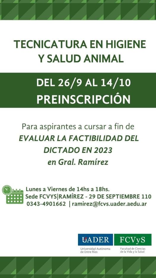 General Ramírez contará, desde 2023, con una nueva propuesta académica de la Facultad de Ciencias de la Vida y la Salud de la Universidad Autónoma de Entre Ríos –UADER-. Se trata de la Tecnicatura en Higiene y Salud Animal.