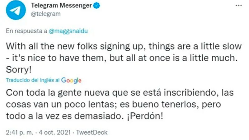 «Con toda la gente nueva que se está registrando, las cosas van un poco lentas. Es bueno tenerlos, pero todo a la vez es demasiado. ¡Perdón!», respondió la cuenta oficial de Telegram en Twitter a un usuario que había reclamado por fallas en su servicio.