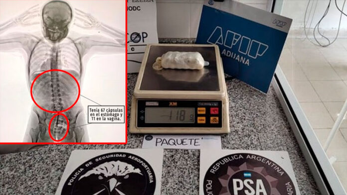 Una joven de 20 años fue detenida en los últimos días en el Aeropuerto Internacional de Ezeiza tras ser descubierta por las autoridades aeroportuarias cuando intentaba viajar a Europa con droga oculta dentro de su cuerpo: le encontraron más de 700 gramos de cocaína en su vagina y su estómago.