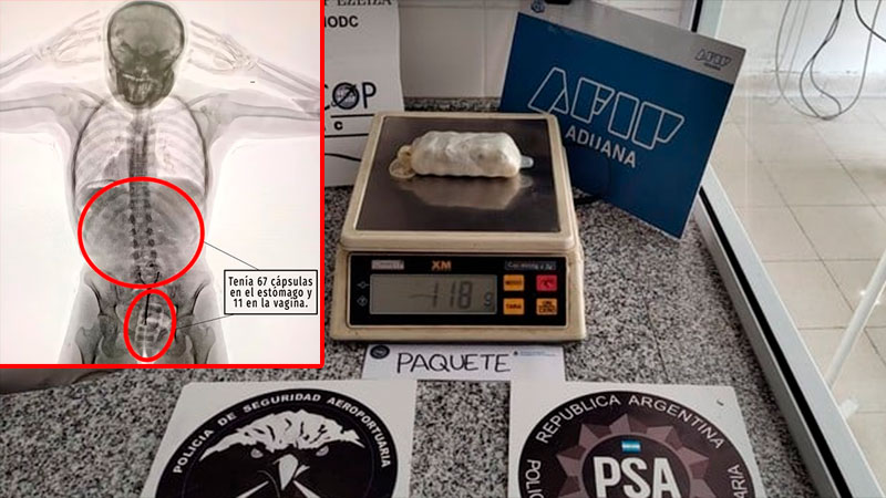 Fuentes del caso informaron a Infobae que, ante las consultas, la pasajera “respondió de manera incongruente y dubitativa”, lo cual levantó aún más las sospechas. Ante esta situación, agentes de la Policía de Seguridad Aeroportuaria (PSA), conjuntamente con funcionarios de la Dirección General de Aduanas y personal de AIRCOP, procedieron a realizarle un control corporal no invasivo mediante equipo de rayos X (Body Scan) y delante de la presencia de testigos.