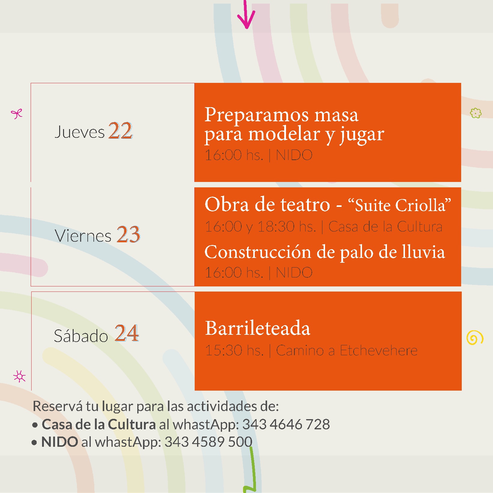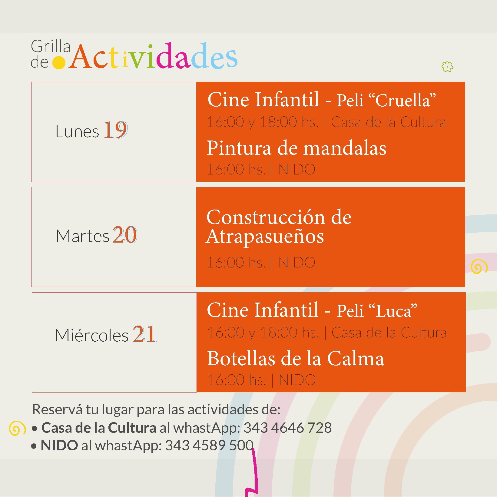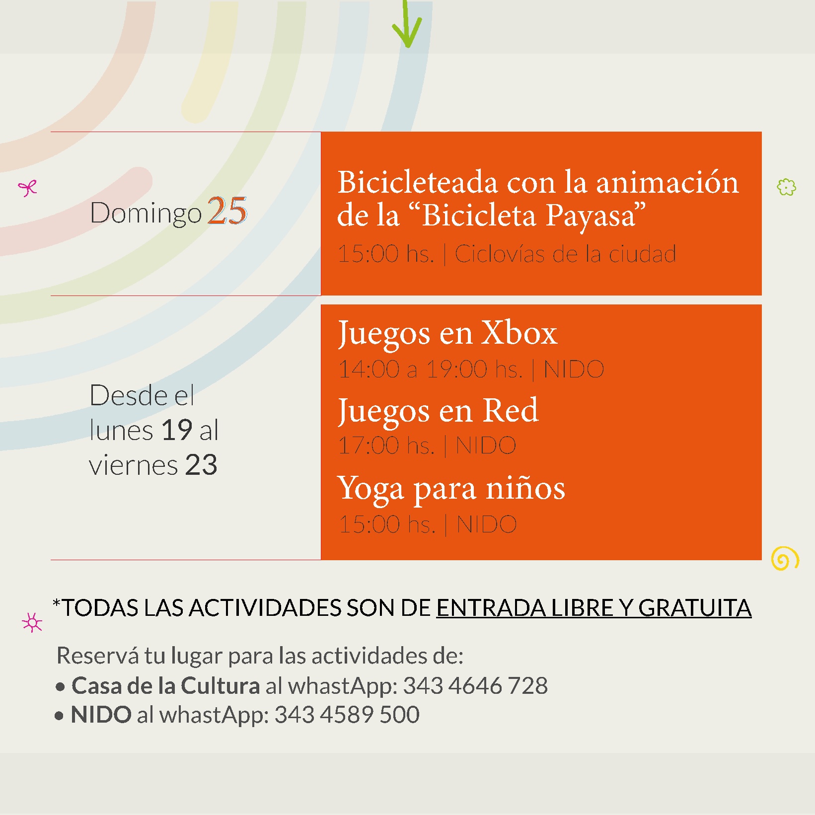Las mismas, son con capacidad reducida, por lo que los interesados deben reservar su lugar para participar escribiendo un WhatsApp a los siguientes números: Casa de la Cultura, 3434646728 o NIDO, 3434598500.