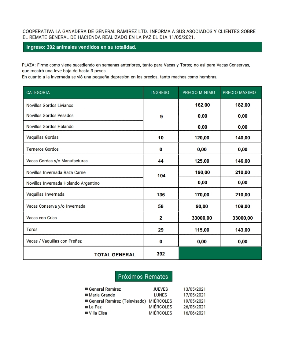 Los próximos remates de La Ganadera son los que se detallan a continuación: este jueves 13, en General Ramírez; el lunes 17, en María Grande; el miércoles 19, en General Ramírez (televisado); el miércoles 26, en La Paz, y el miércoles 16 de junio, en Villa Elisa.