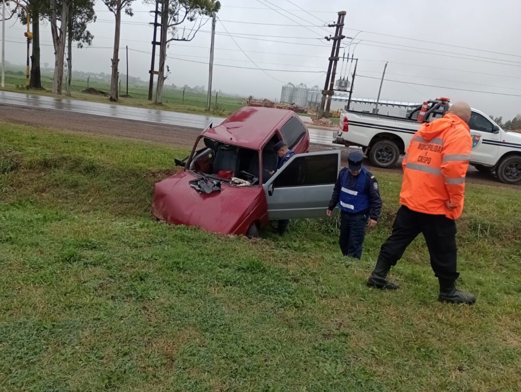 El Fiat continuó su trayectoria descontrolada hasta terminar caído de punta en una zanja del ingreso, paralela a la ruta. El rodado quedó seriamente dañado, mientras que el conductor presentaba dolor en su rodilla, siendo derivado a un centro asistencial.