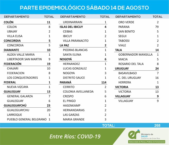 El área de Vigilancias Epidemiológica del Ministerio de Salud, confirmó que en Entre Ríos este sábado se registraron 268 nuevos casos de coronavirus.