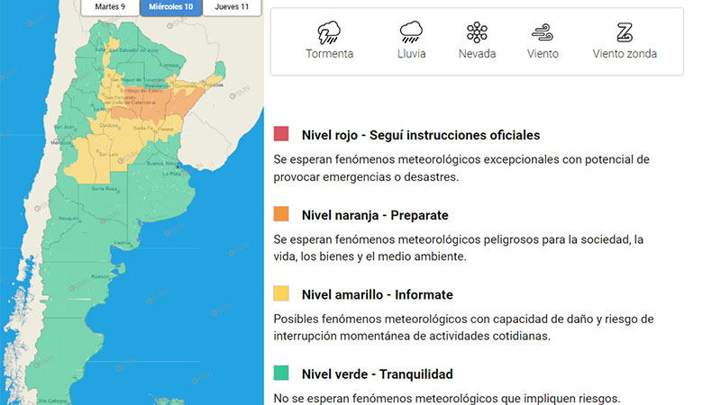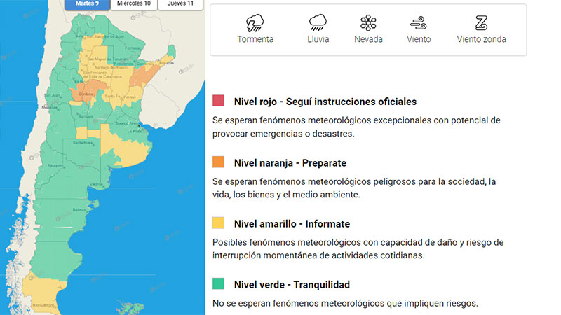 A la vez, rige un alerta amarillo para el centro y norte provincial tanto para este martes como para el miércoles. El área será afectada por tormentas, algunas localmente fuertes. Las mismas estarán acompañadas por ráfagas intensas, fuerte actividad eléctrica, ocasional caída de granizo y abundante caída de agua en cortos períodos.